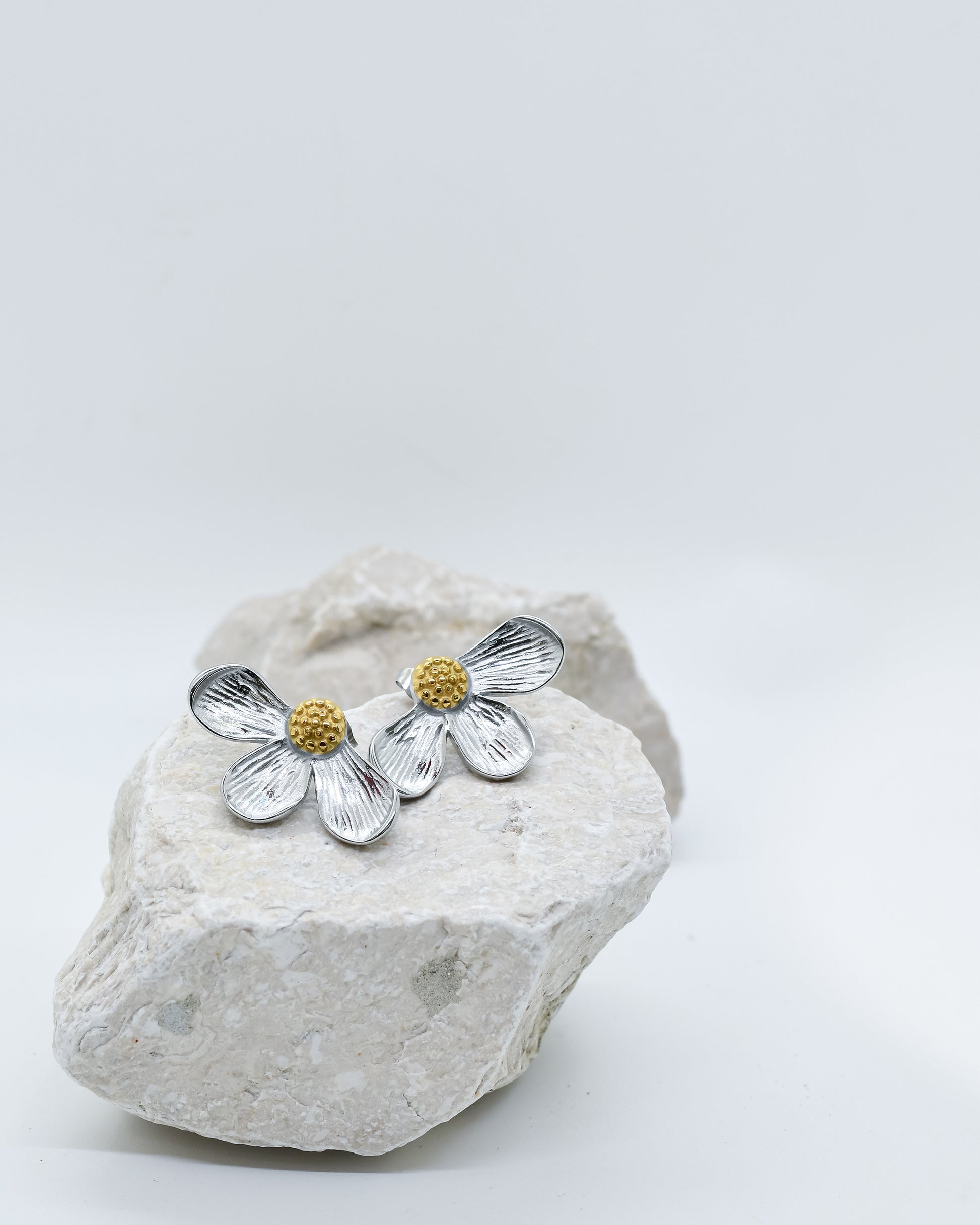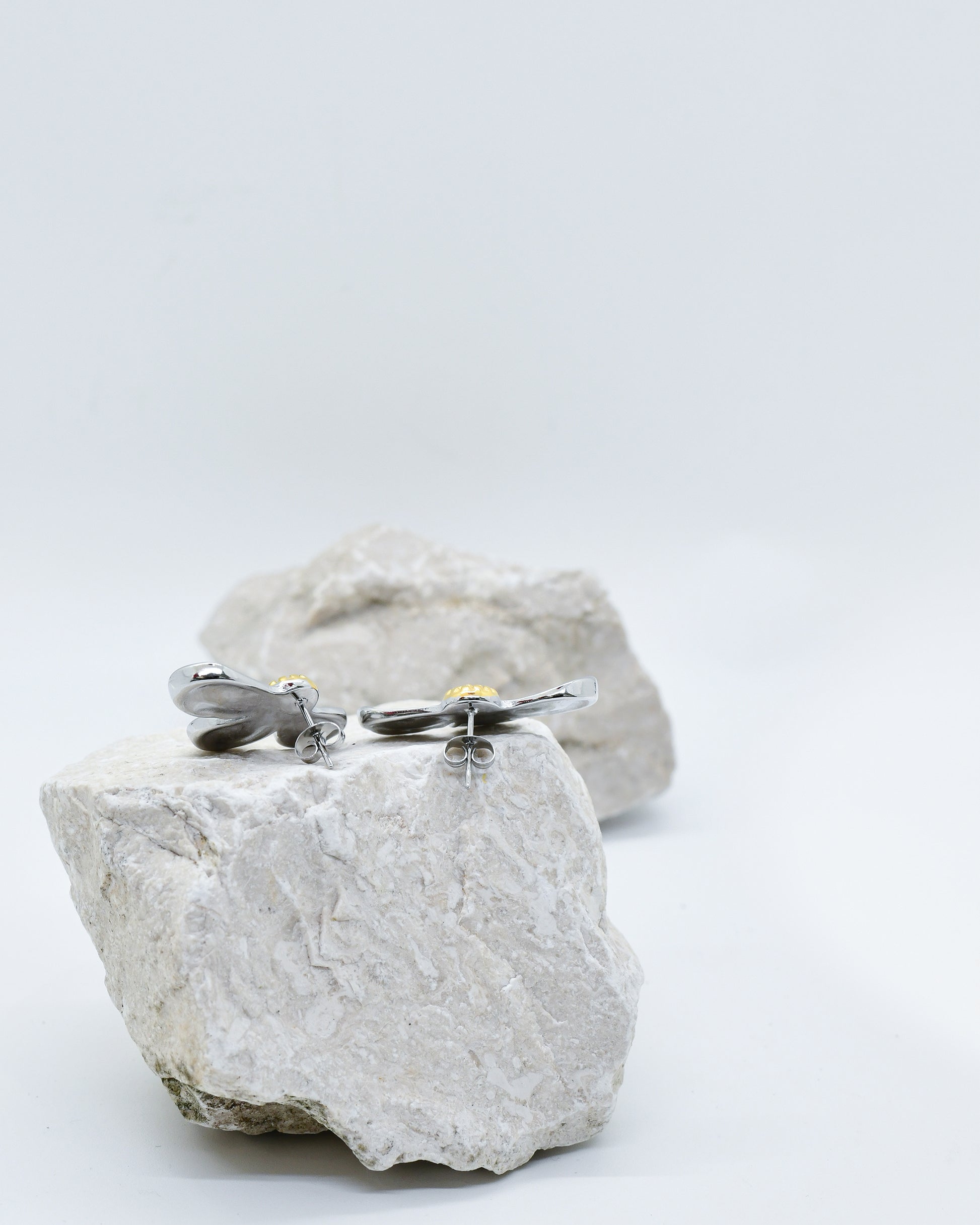Pantallas de acero inoxidable con diseño de flor a mitad, donde los pétalos son plateados y el centro brilla en dorado, creando un contraste sofisticado y contemporáneo.Un accesorio versátil que aporta un toque elegante y moderno a cualquier look, ideal para destacar con estilo único.