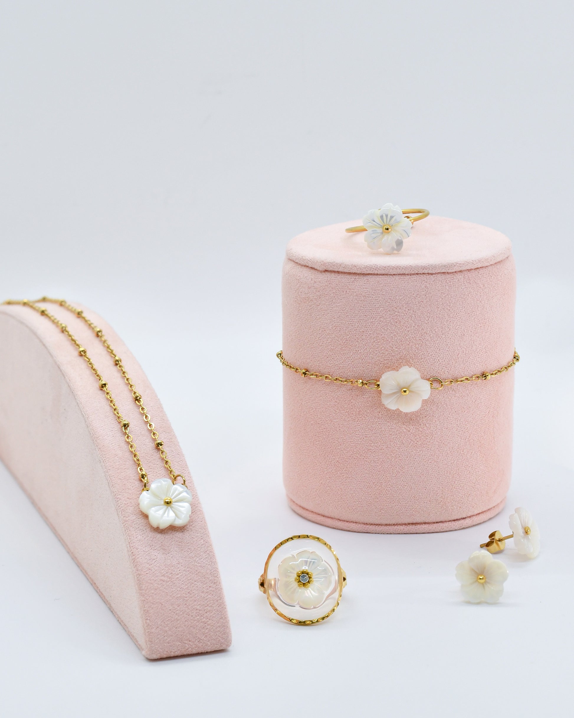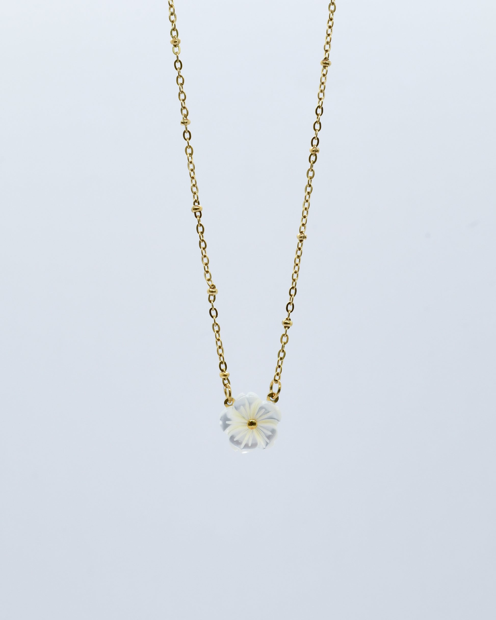 Cadena de acero inoxidable con un delicado colgante en forma de flor de playa blanca, símbolo de frescura y pureza. Un accesorio sencillo pero encantador, perfecto para dar un toque tropical y femenino a tu estilo diario.