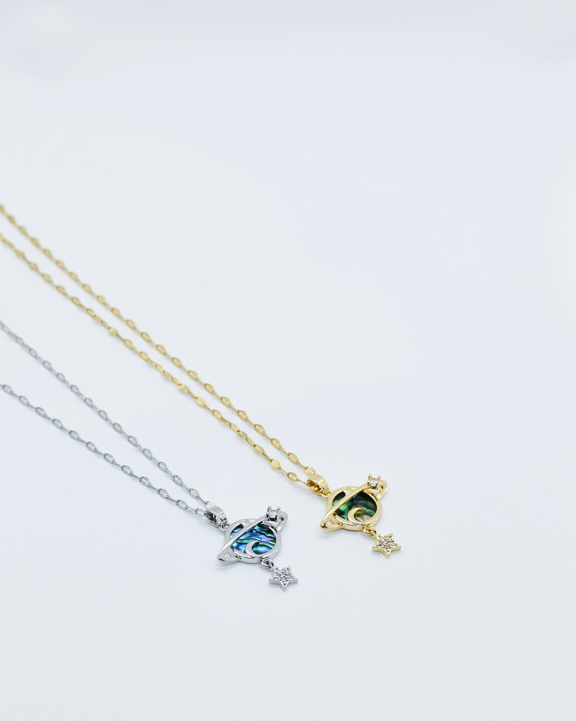 Luce el encanto del universo con esta cadena de acero inoxidable disponible en dorado y plateado. Su dije de Saturno con acabado tornasol refleja tonos únicos que cambian con la luz, mientras una delicada estrella con brillantes piedras cuelga de su anillo, añadiendo un toque de brillo celestial. ✨